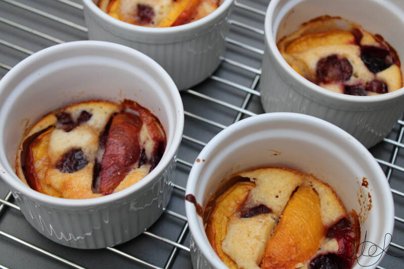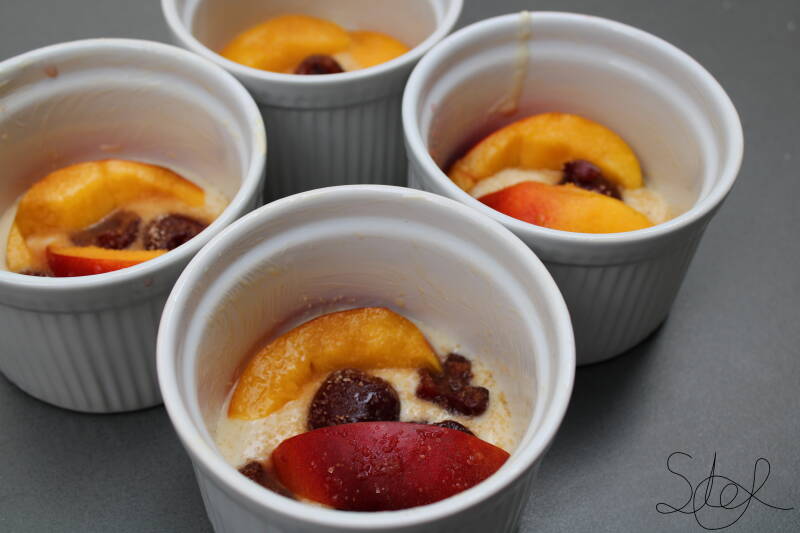 5. Verdeel het beslag over de schaaltjes, doe hierbij het fruit. Strooi er wat rietsuiker overheen.