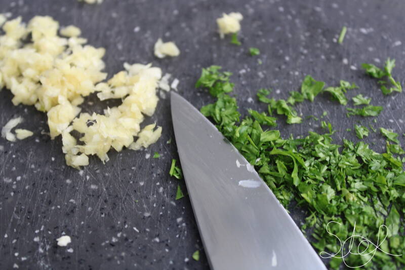 3. Zorg ervoor dat de peterselie en de knoflook super fijn zijn gesneden. Mix dit allemaal door elkaar.
