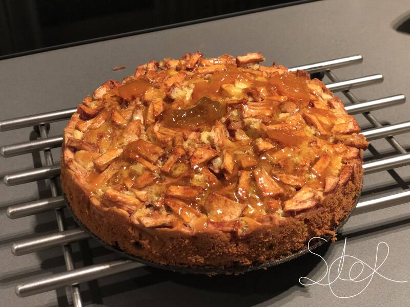 9. Stort het cakebeslag in de springvorm en daar bovenop de stukjes appel. Druk de stukjes appel in beetje erin, maar niet te veel!