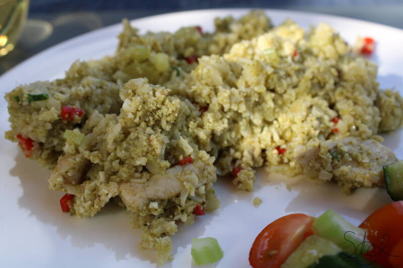 Een uitprobeersel wat uiteindelijk toch lekker bleek te zijn. Ik maakte deze bloemkool rijst/risotto met groene pesto.