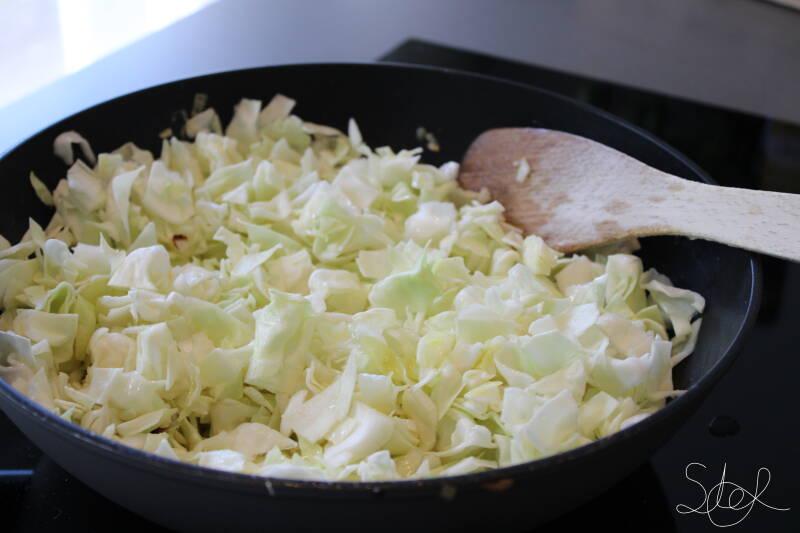 2. Snij ondertussen de kool fijn en spoel schoon, laat uitlekken. Schep de uien met de kip uit de pan en bak vervolgens de kool in het vet van de uien en kip voor ong. 3 minuten. Zorg ervoor dat hij nog een beetje een bite heeft maar toch ook gaar is.