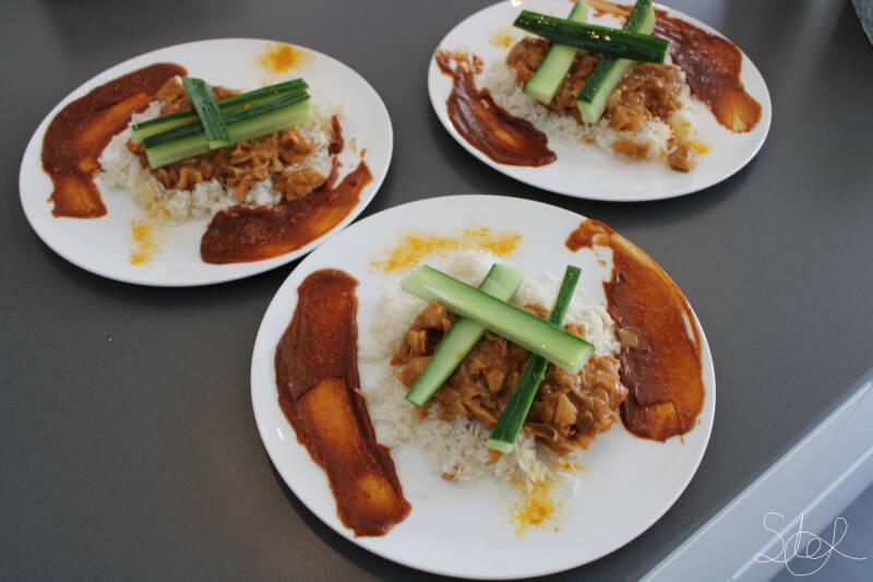 9. Dien vervolgens op. Schep de rijst in het midden van het bord, maak 2 strepen satesaus met de achterkant van een lepel. Breng op smaak met een beetje kurkuma aan de zijkanten. Schep het spitskool kip mengsel op de rijst en leg daar 3 stukjes komkommer uit de azijn op.