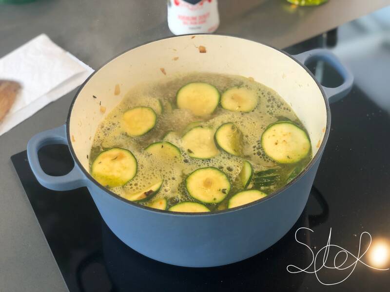 5.Voeg vervolgens de bouillon toe aan de courgette, breng aan de kook en laat het vervolgens +/- 10 min. Op laag vuur pruttelen.