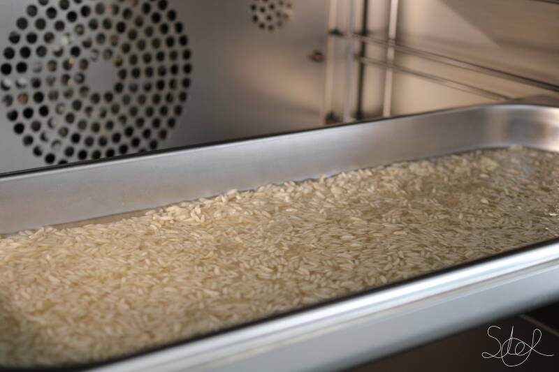 1. doe de rijst in de gesloten stoomovenpan met het water. Het aantal gram rijst dat je neemt is tevens ook het aantal ml water wat erbij gaat.